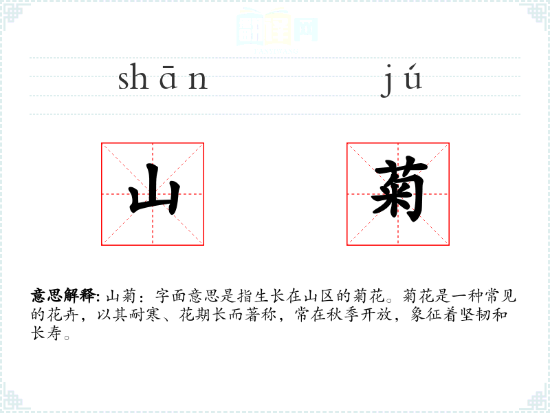 山菊:字面意思是指生长在山区的菊花。菊花是一种常见的花卉,以其耐寒、花期长而著称,常在秋季开放,象征着坚韧和长寿。