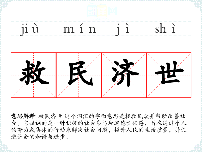 通过对“救民济世”的深入学*,我更加认识到这个词汇在激励人们参与社会建设中的重要性。它不仅是一个词汇,更是一种价值观和行动指南,鼓励我们在日常生活中实践社会责任和道德关怀。