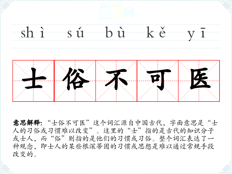 “士俗不可医”这个词汇源自*古代,字面意思是“士人的俗或惯难以改变”。这里的“士”指的是古代的知识分子或士人,而“俗”则指的是他们的惯或俗。整个词汇表达了一种观念,即士人的某些根深蒂固的惯或思想是难以通过常规手段改变的。