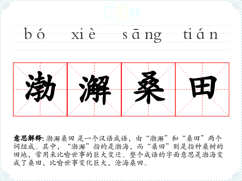 渤澥桑田 是一个汉语成语,由“渤澥”和“桑田”两个词组成。其中,“渤澥”指的是渤海,而“桑田”则是指种桑树的田地,常用来比喻世事的巨大变迁。整个成语的字面意思是渤海变成了桑田,比喻世事变化巨大,沧海桑田。