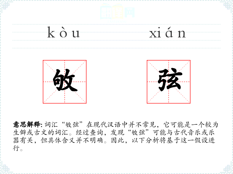 词汇“敂弦”在现代汉语中并不常见,它可能是一个较为生僻或古文的词汇。经过查询,发现“敂弦”可能与古代音乐或乐器有关,但具体含义并不明确。因此,以下分析将基于这一假设进行。
