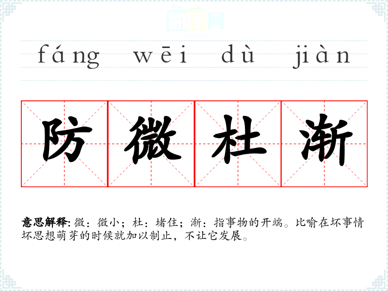微:微小;杜:堵住;渐:指事物的开端。比喻在坏事情坏思想萌芽的时候就加以制止,不让它发展。