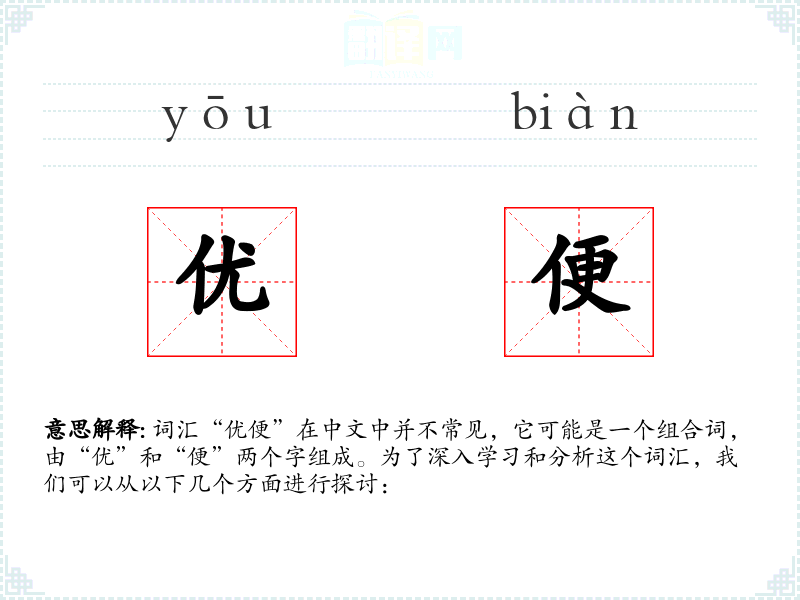词汇“优便”在中文中并不常见,它可能是一个组合词,由“优”和“便”两个字组成。为了深入学习和分析这个词汇,我们可以从以下几个方面进行探讨: