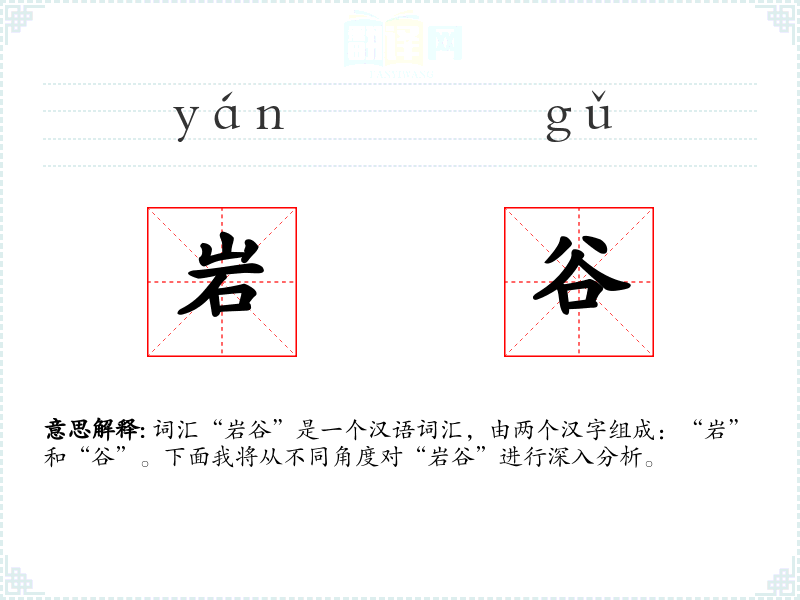 “岩谷”字面意思是指岩石构成的山谷。其中,“岩”指的是坚硬的石头或岩石,“谷”则是指两山之间的低地或河流流经的狭长地带。