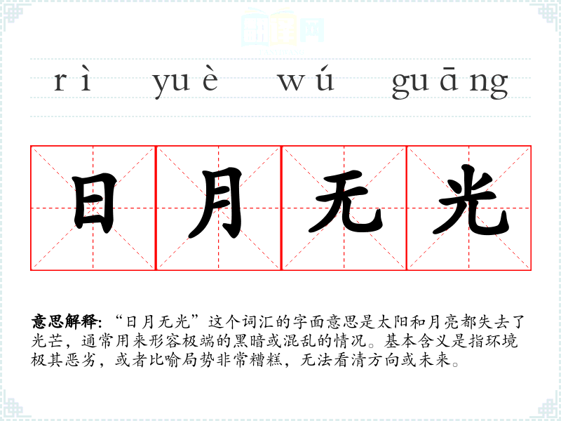 “日月无光”这个词汇的字面意思是太阳和月亮都失去了光芒,通常用来形容极端的黑暗或混乱的情况。基本含义是指环境极其恶劣,或者比喻局势非常糟糕,无法看清方向或未来。