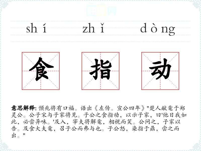 1.预兆将有口福。语出《左传。宣公四年》"楚人献鼋于郑灵公。公子宋与子家将见。子公之食指动,以示子家,曰'他日我如此,必尝异味。'及入,宰夫将解鼋,相视而笑。公问之,子家以告。及食大夫鼋,召子公而弗与也。子公怒,染指于鼎,尝之而出。"