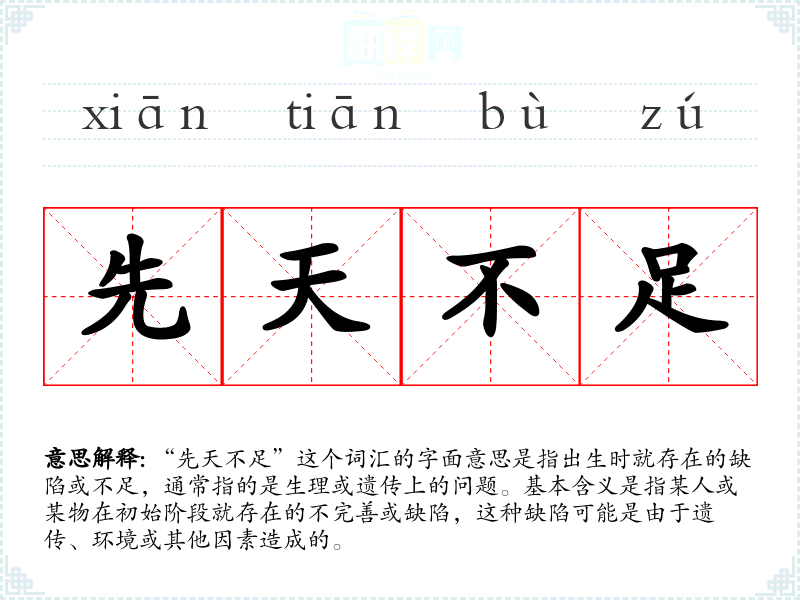 “先天不足”这个词汇的字面意思是指出生时就存在的缺陷或不足,通常指的是生理或遗传上的问题。基本含义是指某人或某物在初始阶段就存在的不完善或缺陷,这种缺陷可能是由于遗传、环境或其他因素造成的。