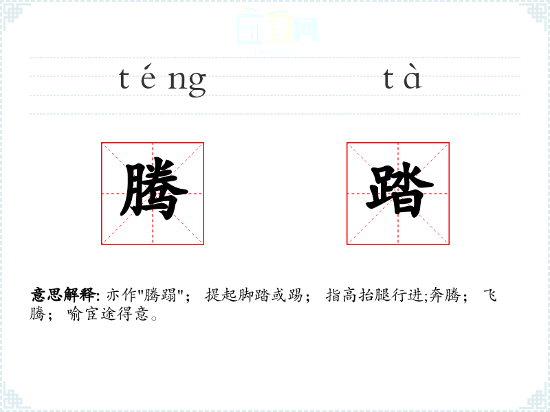 亦作"腾蹋"; 提起脚踏或踢; 指高抬腿行进;奔腾; 飞腾; 喻宦途得意。
