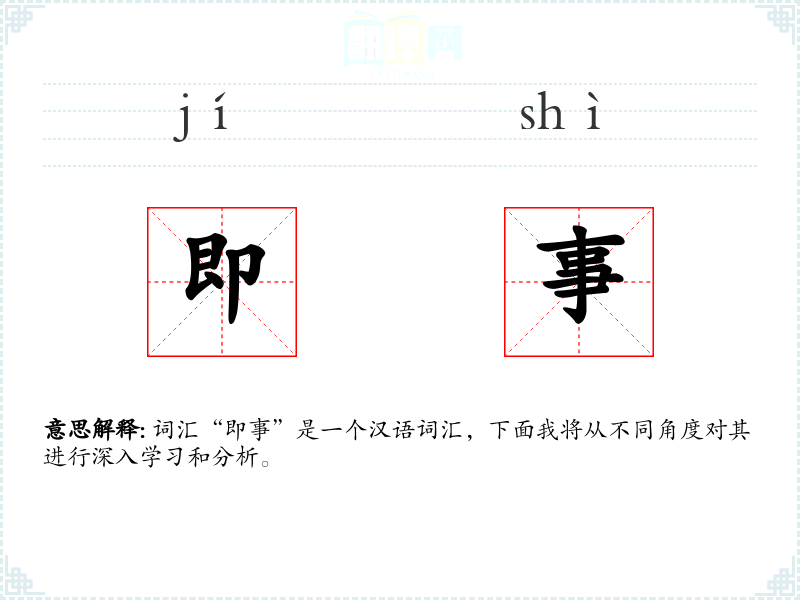 词汇“即事”是一个汉语词汇,下面我将从不同角度对其进行深入学*和分析。