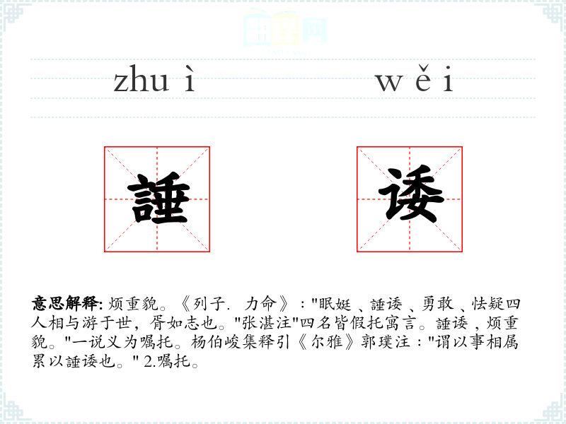 烦重貌。《列子.力命》﹕"眠娗﹑諈诿﹑勇敢﹑怯疑四人相与游于世,胥如志也。"张湛注"四名皆假托寓言。諈诿﹐烦重貌。"一说义为嘱托。杨伯峻集释引《尔雅》郭璞注﹕"谓以事相属累以諈诿也。" 2.嘱托。