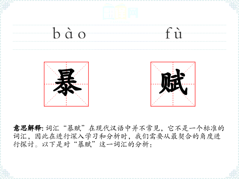 词汇“暴赋”在现代汉语中并不常见,它不是一个标准的词汇,因此在进行深入学*和分析时,我们需要从最契合的角度进行探讨。以下是对“暴赋”这一词汇的分析: