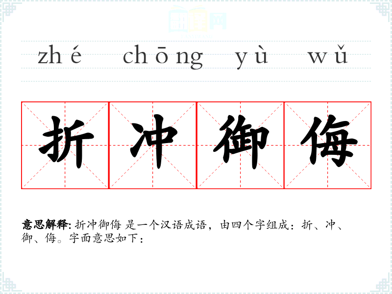 折冲御侮 是一个汉语成语,由四个字组成:折、冲、御、侮。字面意思如下: