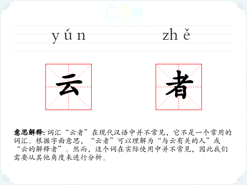 词汇“云者”在现代汉语中并不常见,它不是一个常用的词汇。根据字面意思,“云者”可以理解为“与云有关的人”或“云的解释者”。然而,这个词在实际使用中并不常见,因此我们需要从其他角度来进行分析。