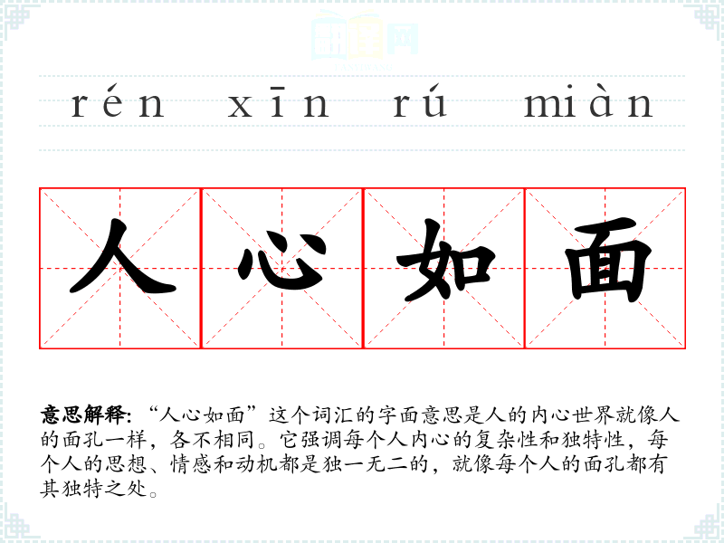 “人心如面”这个词汇的字面意思是人的内心世界就像人的面孔一样,各不相同。它强调每个人内心的复杂性和独特性,每个人的思想、情感和动机都是独一无二的,就像每个人的面孔都有其独特之处。