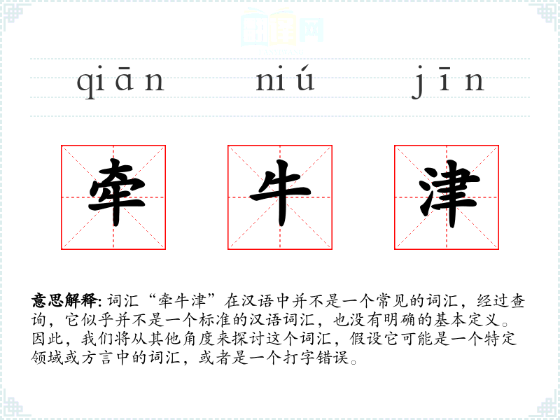由于“牵牛津”不是一个标准的汉语词汇,我们无法提供一个确切的基本定义。如果这是一个打字错误,它可能是指“牵牛花”或“天津”,这两个词汇在汉语中是有明确含义的。