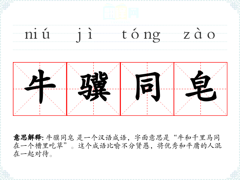 牛骥同皂 是一个汉语成语,字面意思是“牛和千里马同在一个槽里吃草”。这个成语比喻不分贤愚,将优秀和平庸的人混在一起对待。