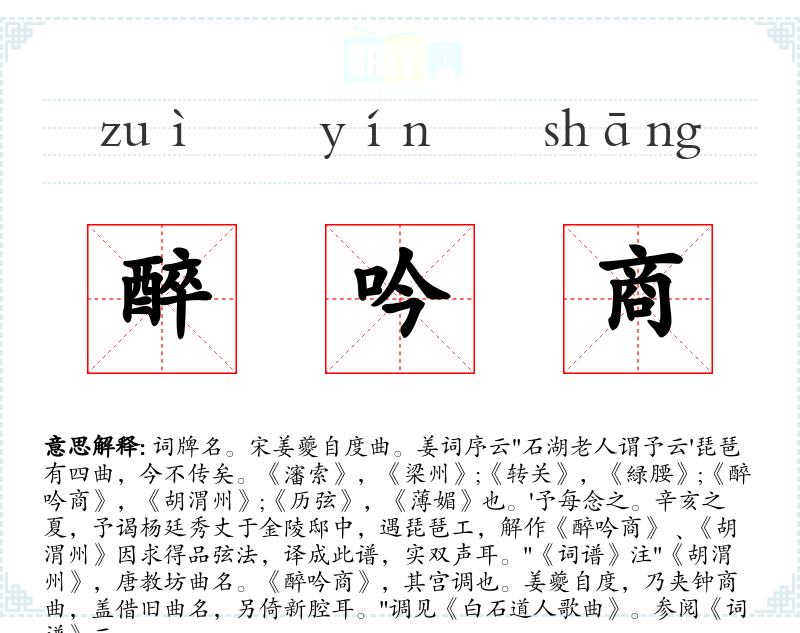 1.词牌名。宋姜夔自度曲。姜词序云"石湖老人谓予云'琵琶有四曲,今不传矣。《瀋索》,《梁州》;《转关》,《緑腰》;《醉吟商》,《胡渭州》;《历弦》,《薄媚》也。'予每念之。辛亥之夏,予谒杨廷秀丈于金陵邸中,遇琵琶工,解作《醉吟商》﹑《胡渭州》因求得品弦法,译成此谱,实双声耳。"《词谱》注"《胡渭州》,唐教坊曲名。《醉吟商》,其宫调也。姜夔自度,乃夹钟商曲,盖借旧曲名,另倚新腔耳。"调见《白石道人歌曲》。参阅《词谱》二。