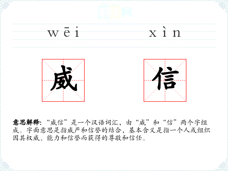 “威信”是一个汉语词汇,由“威”和“信”两个字组成。字面意思是指威严和信誉的结合,基本含义是指一个人或组织因其权威、能力和信誉而获得的尊敬和信任。