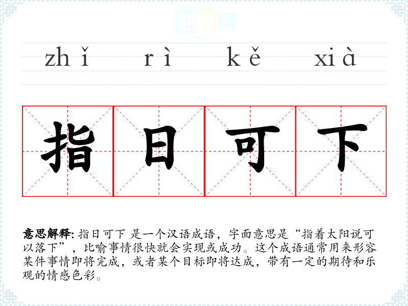 指日可下 是一个汉语成语,字面意思是“指着太阳说可以落下”,比喻事情很快就会实现或成功。这个成语通常用来形容某件事情即将完成,或者某个目标即将达成,带有一定的期待和乐观的情感色彩。