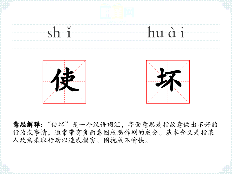 “使坏”是一个汉语词汇,字面意思是指故意做出不好的行为或事情,通常带有负面意图或恶作剧的成分。基本含义是指某人故意采取行动以造成损害、困扰或不愉快。