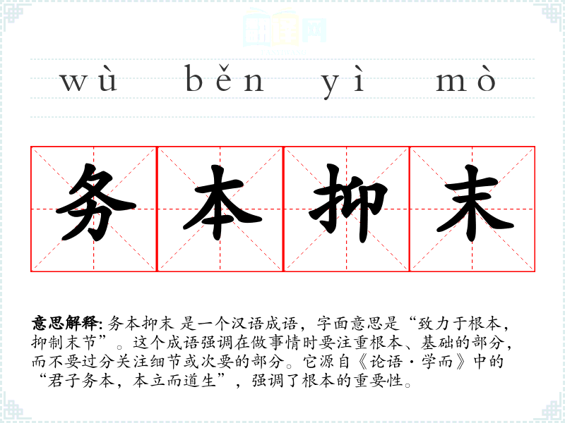 务本抑末 是一个富有哲理的成语,它不仅指导我们在处理问题时要抓住根本,也提醒我们在生活中要注重基础和长远规划。在语言学*和表达中,理解和运用这个成语可以提升我们的思维深度和表达的准确性。