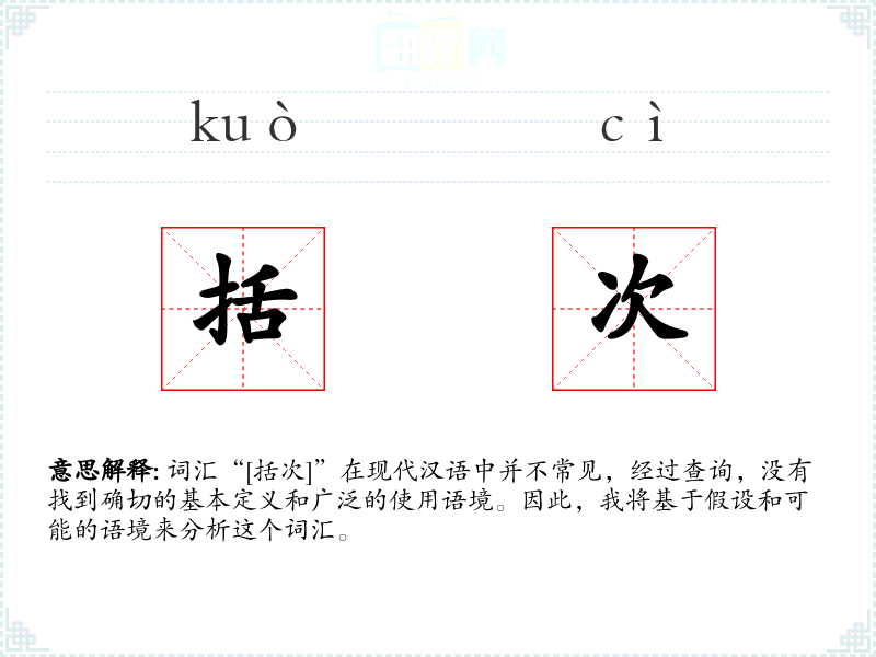 词汇“[括次]”在现代汉语中并不常见,经过查询,没有找到确切的基本定义和广泛的使用语境。因此,我将基于假设和可能的语境来分析这个词汇。