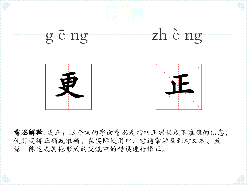 更正:这个词的字面意思是指纠正错误或不准确的信息,使其变得正确或准确。在实际使用中,它通常涉及到对文本、数据、陈述或其他形式的交流中的错误进行修正。