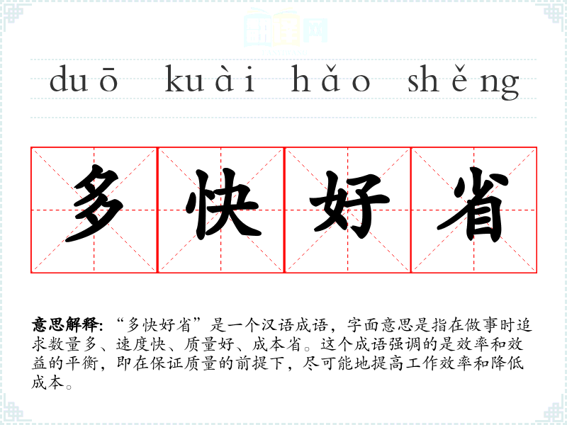 “多快好省”是一个汉语成语,字面意思是指在做事时追求数量多、速度快、质量好、成本省。这个成语强调的是效率和效益的平衡,即在保证质量的前提下,尽可能地提高工作效率和降低成本。