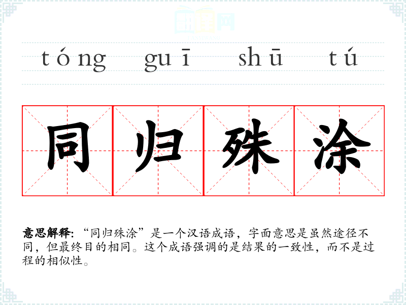 “同归殊涂”是一个汉语成语,字面意思是虽然途径不同,但最终目的相同。这个成语强调的是结果的一致性,而不是过程的相似性。