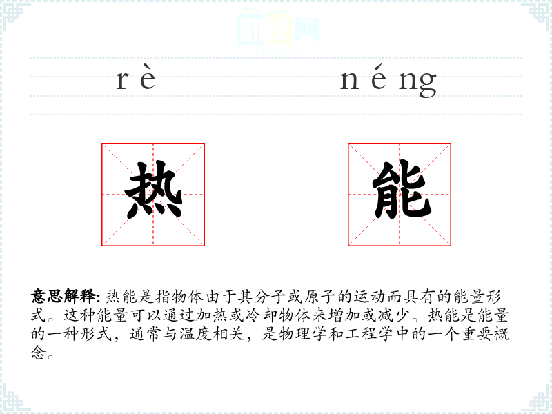 - 反义词:冷能(非标准词汇,通常用“冷”或“低温”来表示相反的概念)