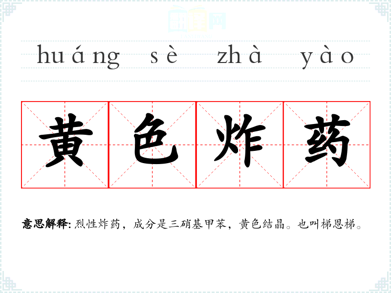 烈性炸药,成分是三硝基甲苯,黄色结晶。也叫梯恩梯。