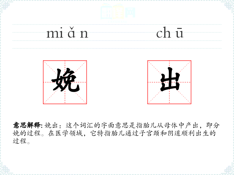 娩出:这个词汇的字面意思是指胎儿从母体中产出,即分娩的过程。在医学领域,它特指胎儿通过子宫颈和阴道顺利出生的过程。