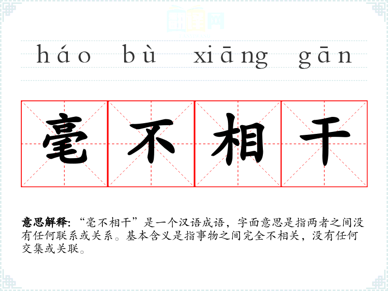 “毫不相干”是一个汉语成语,字面意思是指两者之间没有任何联系或关系。基本含义是指事物之间完全不相关,没有任何交集或关联。