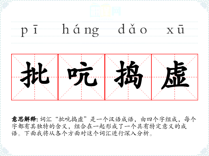 词汇“批吭捣虚”是一个汉语成语,由四个字组成,每个字都有其独特的含义,组合在一起形成了一个具有特定意义的成语。下面我将从各个方面对这个词汇进行深入分析。