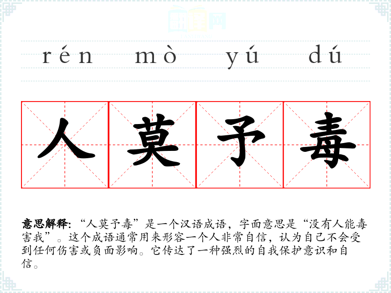 “人莫予毒”是一个汉语成语,字面意思是“没有人能毒害我”。这个成语通常用来形容一个人非常自信,认为自己不会受到任何伤害或负面影响。它传达了一种强烈的自我保护意识和自信。