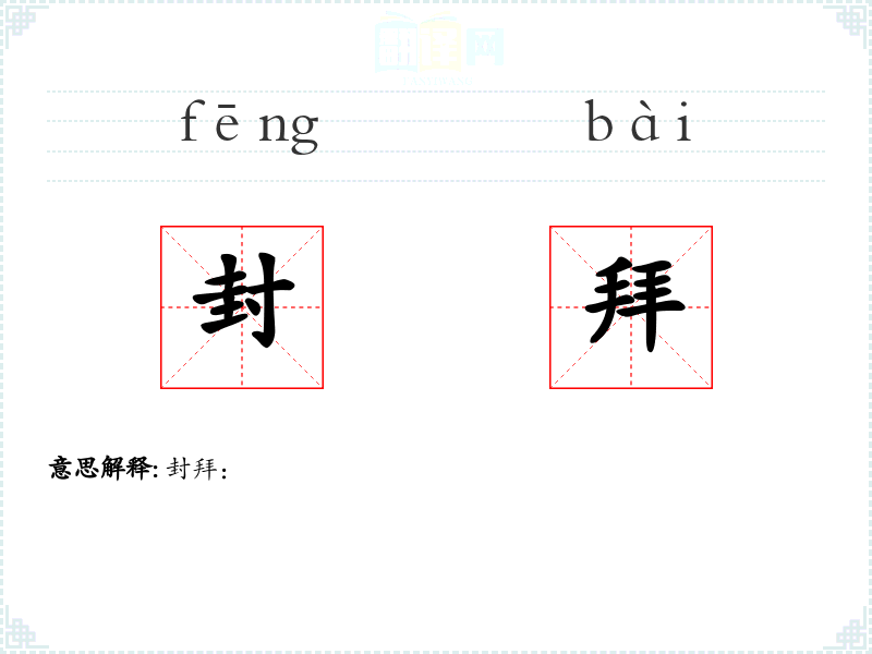 - 词源:封拜源自古代汉语,封指封赏土地或爵位,拜指正式授予。