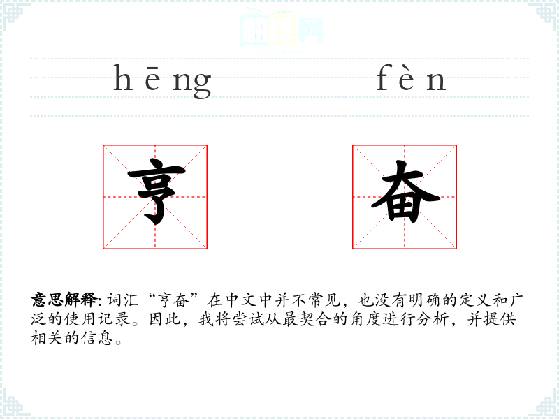由于“亨奋”不是一个标准的汉语词汇,我们无法提供一个确切的基本定义。但从字面上看,“亨”通常与顺利、通达相关,而“奋”则意味着振奋、努力。结合起来,我们可以推测“亨奋”可能指的是在顺利的情况下振奋努力的状态或行为。