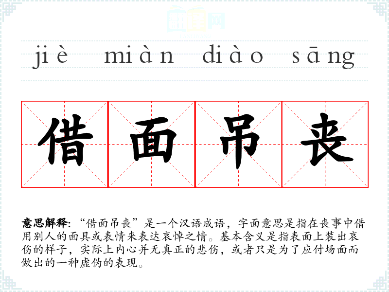 “借面吊丧”是一个汉语成语,字面意思是指在丧事中借用别人的面具或表情来表达哀悼之情。基本含义是指表面上装出哀伤的样子,实际上内心并无真正的悲伤,或者只是为了应付场面而做出的一种虚伪的表现。