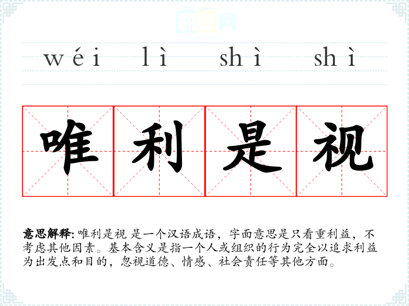 唯利是视 是一个汉语成语,字面意思是只看重利益,不考虑其他因素。基本含义是指一个人或组织的行为完全以追求利益为出发点和目的,忽视道德、情感、社会责任等其他方面。