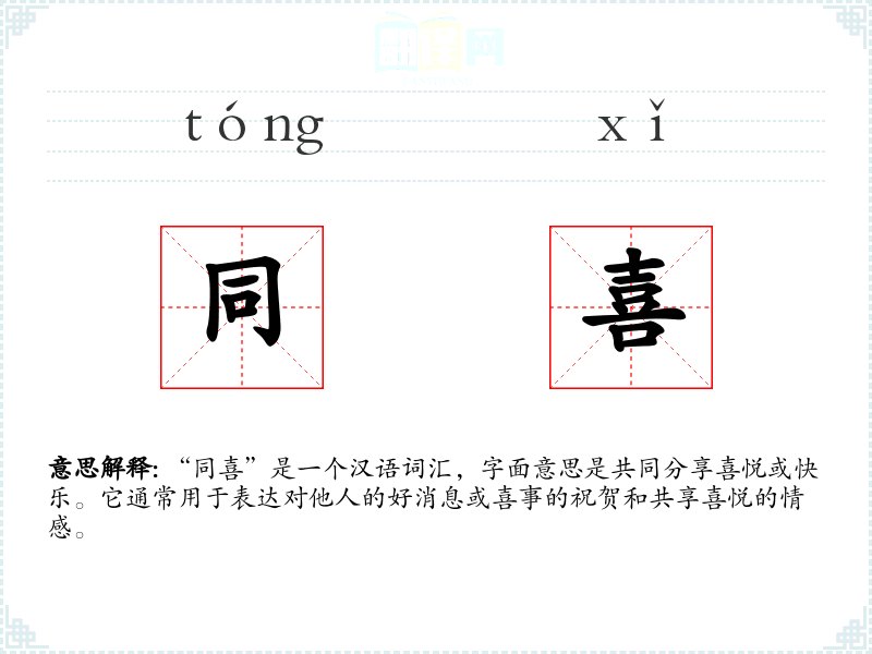 - 同义词:恭喜、祝贺、庆贺。这些词汇都表达了对他人喜事的祝福,但“同喜”更强调共同分享喜悦的情感。
