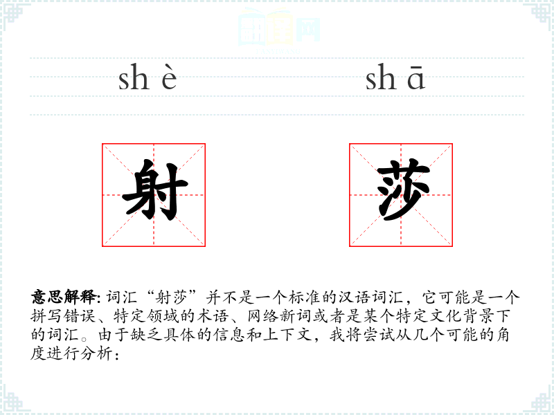 由于“射莎”不是一个标准词汇,我们无法给出确切的字面意思和基本含义。它可能是一个打字错误,正确的词汇可能是“射杀”、“射击”或者其他与“射”相关的词汇。