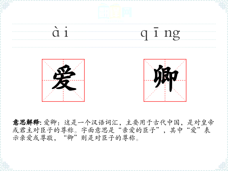 爱卿:这是一个汉语词汇,主要用于古代,是对或君主对臣子的尊称。字面意思是“亲爱的臣子”,其中“爱”表示亲爱或尊敬,“卿”则是对臣子的尊称。