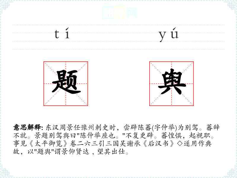 1.东汉周景任豫州刺史时,尝辟陈蕃(字仲举)为别驾。蕃辞不就。景题别驾舆曰"陈仲举座也。"不复更辟。蕃惶惧,起视职。事见《太平御览》卷二六三引三国吴谢承《后汉书》◇遂用作典故,以"题舆"谓景仰贤达﹐望其出仕。