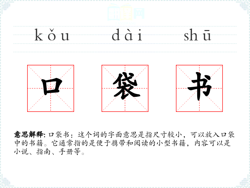 口袋书:这个词的字面意思是指尺寸较小,可以放入口袋中的书籍。它通常指的是便于携带和阅读的小型书籍,内容可以是小说、指南、手册等。