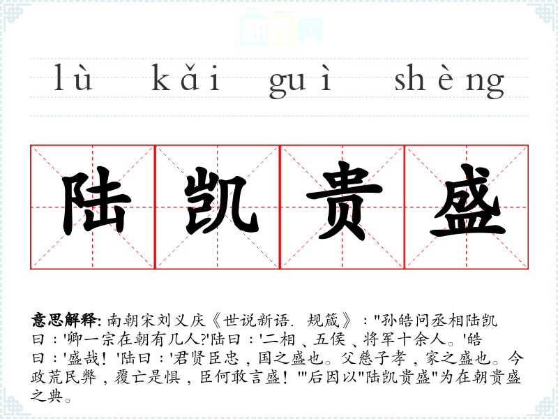 1.南朝宋刘义庆《世说新语.规箴》﹕"孙皓问丞相陆凯曰﹕'卿一宗在朝有几人?'陆曰﹕'二相﹑五侯﹑将军十余人。'皓曰﹕'盛哉!'陆曰﹕'君贤臣忠﹐国之盛也。父慈子孝﹐家之盛也。今政荒民弊﹐覆亡是惧﹐臣何敢言盛!'"后因以"陆凯贵盛"为在朝贵盛之典。