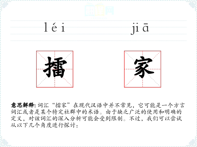 词汇“擂家”在现代汉语中并不常见,它可能是一个方言词汇或者是某个特定社群中的术语。由于缺乏广泛的使用和明确的定义,对该词汇的深入分析可能会受到限制。不过,我们可以尝试从以下几个角度进行探讨: