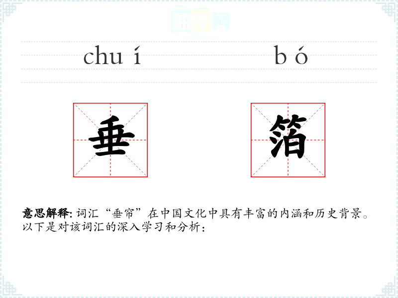 词汇“垂帘”在*文化中具有丰富的内涵和历史背景。以下是对该词汇的深入学和分析: