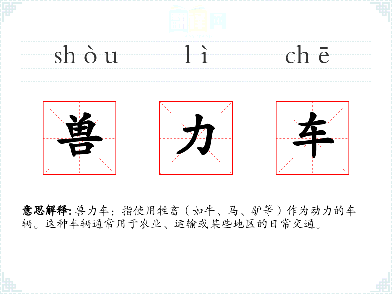 - 不同语言或文化中的对应词汇:在英语中,类似的词汇可能是“animal-drawn vehicle”或“ox cart”、“horse cart”等。在不同文化中,兽力车的使用和象征意义可能有所不同。