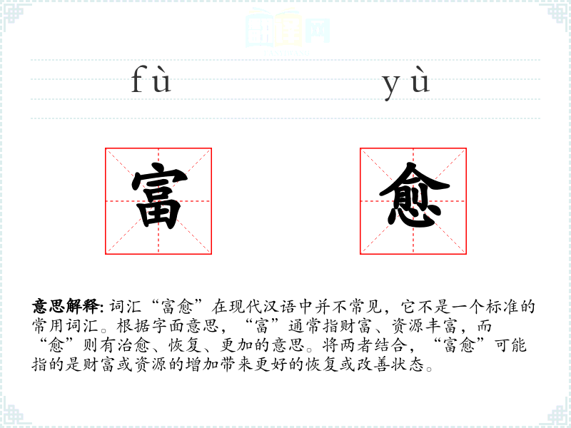 词汇“富愈”在现代汉语中并不常见,它不是一个标准的常用词汇。根据字面意思,“富”通常指财富、资源丰富,而“愈”则有治愈、恢复、更加的意思。将两者结合,“富愈”可能指的是财富或资源的增加带来更好的恢复或改善状态。