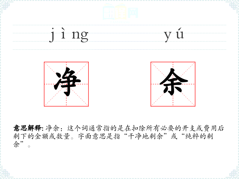 净余:这个词通常指的是在扣除所有必要的开支或费用后剩下的金额或数量。字面意思是指“干净地剩余”或“纯粹的剩余”。
